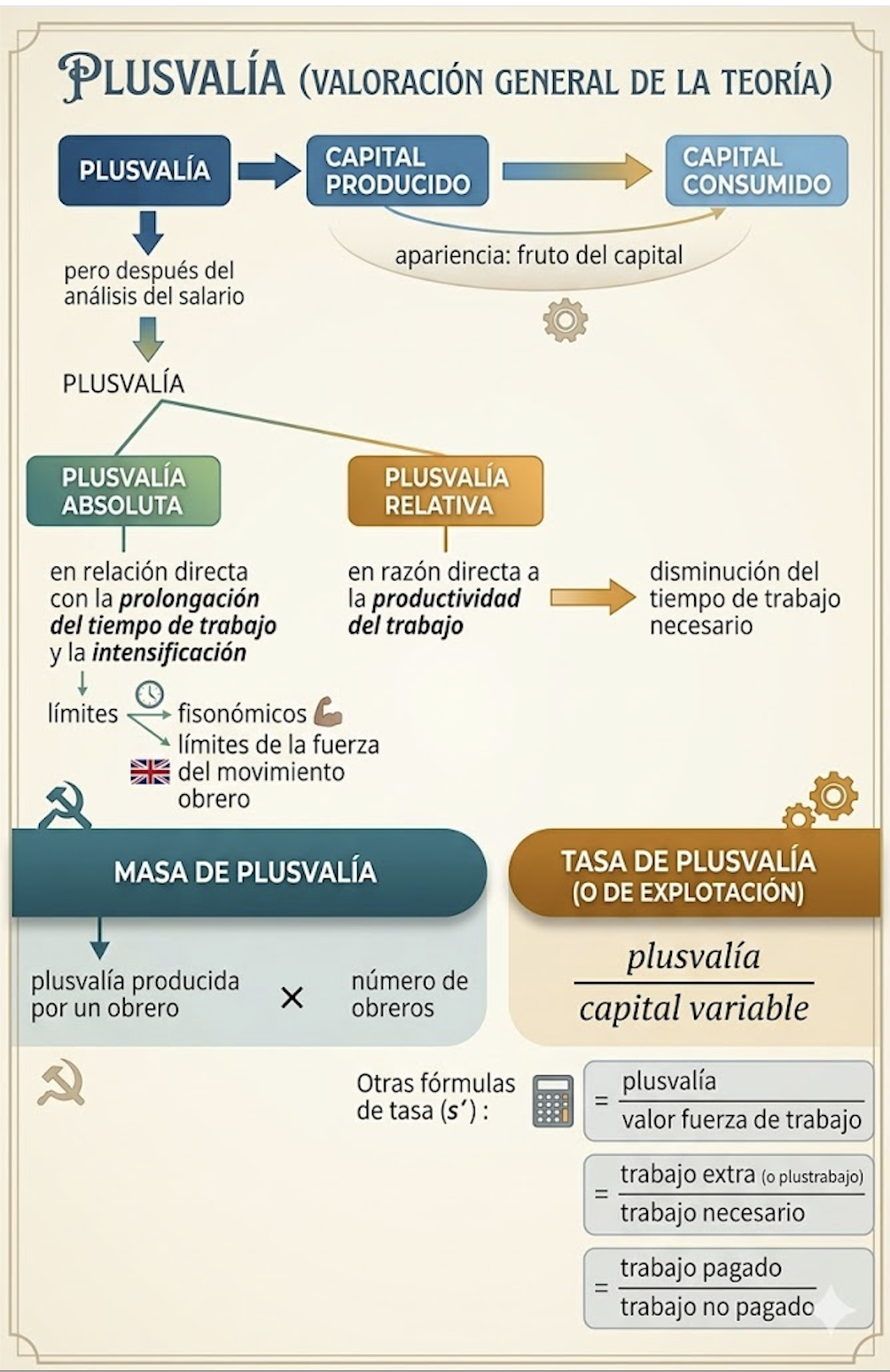 Ahora pasaremos a un tema fundamental de la sección segunda, capítulo IV, que versa sobre la transformación del dinero en capital. Tenemos que el trabajador produce mercancías que a su vez tienen un valor de uso y un valor de cambio. Sucede que el valor de cambio que tienen estas mercancías es superior al valor de cambio que tiene la fuerza productiva(salario). Sin importar si añadimos otros gastos por parte del capitalista, ya sea en mantencion o compra de maquinaria, siempre va haber una diferencia entre el precio de las mercancías y el salario. La plusvalía consistiría en el valor que el trabajo no pagado del obrero asalariado crea por encima del valor de su fuerza de trabajo y del que se apropia gratuitamente el capitalista. También podemos entender la plusvalía como la diferencia entre la riqueza producida por el trabajo del proletaruo y el salario que éste recibe del capitalista.