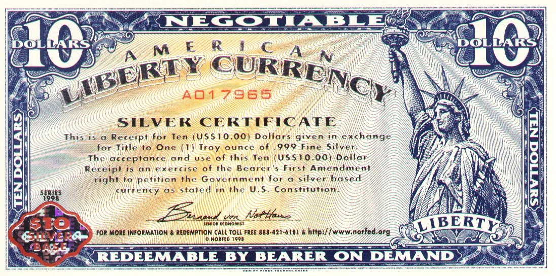 Pasamos a una tercera forma de dinero, que es el dinero fiduciario o dinero fiat (“hágase”). Ejemplos de esta clase de dinero son los pesos, euros, dólares, yenes, etc. ¿Cuál es la novedad de esta clase dinero? La repuesta: no tiene respaldo alguno, es decir, si no está contento con su billete por ser de mala calidad (bajo poder adquisitivo), como es el caso del bolívar venezolano, sólo podrá obtener a cambio otro billete igual. Otra característica de este dinero es que es de curso legal y forzoso, de manera que uno no puede acuñar dinero propio, como fue el caso del “Liberty Dollar” creado por Bernard von NotHaus, y que le costó una demanda que puede llevarlo a la cárcel. Friedrich Hayek fue un defensor de la banca libre y la libertad de elección de la moneda. En palabras de Hayek: "