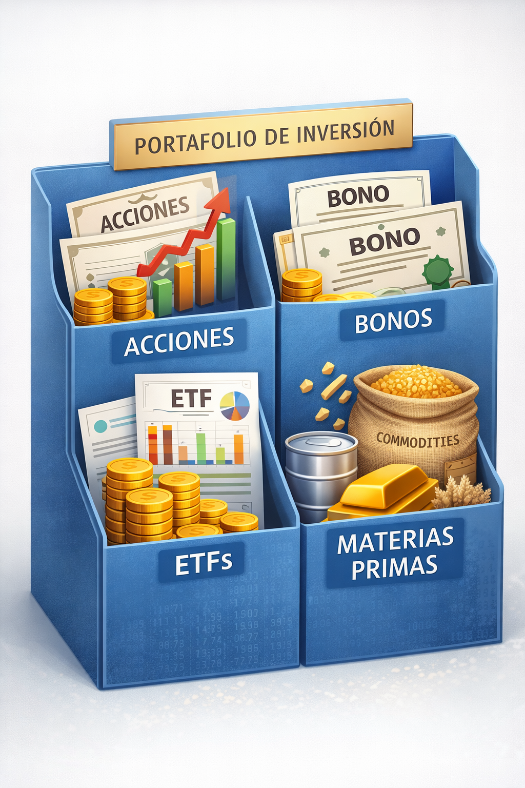 El concepto de diversificar es fácil de entender y suele resumirse en “no poder todos los huevos en una misma canasta”. En otras palabras, diversificar consiste en invertir en distintos tipos de activos como acciones de empresas de diverso rubros, bonos, materias primas, fondos indexados y Etfs. También es importante diversificar geográficamente y considerar la correlación entre activos. Como afirma Jaime Alonso: “Para diversificar se pueden incluir otro tipo de activos, pero lo importante es que estén descorrelacionados. Si tengo acciones e incluyo un bono de la misma geografía y sector, reduciré mucho menos el riesgo que si incluyo un bono de otra geografía y sector”. Si tenemos un portafolio con ctivos, ¿cómo calculamos la rentabilidad? Vamos por partes. Consideremos el siguiente portafolio con solo 3 activos