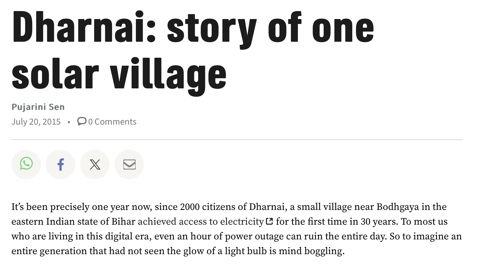 Pero finalmente se impuso la realidad y sucedió que las baterías se agotaron rápidamente y no servían siquiera para poder cocinar. La consecuencia de esto fue las personas continuaron usando sus cocinas quemando madera o estiércol, lo cual contaminaba la casa y ponía en jaque la salud de la familia. Cuando el jefe ministro del Estado de Bihar, donde se localizaba la aldea, fue a la inauguración, los aldeanos demandaban “electricidad de verdad”. Afortunadamente Dharnai logró conectarse a la red nacional recibiendo así energía fiable. Greenpeace respondió en un artículo titulado “Dharnai: story of one solar village”, en donde se da a entender que no se puede generalizar a partir de un caso que fracasó.