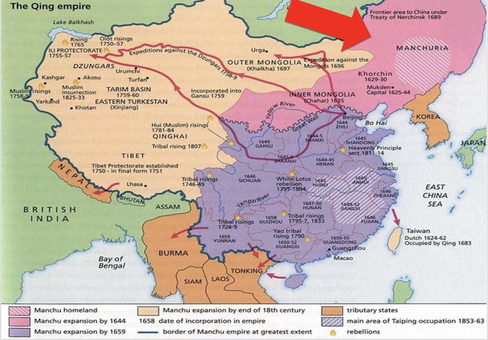 De acuerdo con las cifras de Fairbank dos millones de manchúes comenzaron a dominar a cerca de cinto veinte millones de chinos, cifra que llegaría a los cuatrocientos millones. Así, y en palabras de Fairbank, si bien los emperadores comenzaron a residir en la Ciudad Prohibida en Pekín, estos también se trasladaban en verano a Mongolia interior donde podía cabalgar y cazar. A esto añade el autor que los emperadores cerraron las puertas de tierra natal para impedir la inmigración china por medio de cientos de kilómetros de empalizadas. Así, de acuerdo con Fairbank, la dinastía hizo de Manchuria del Norte un terreno delimitado y destinado a la caza y fuera de la economía china