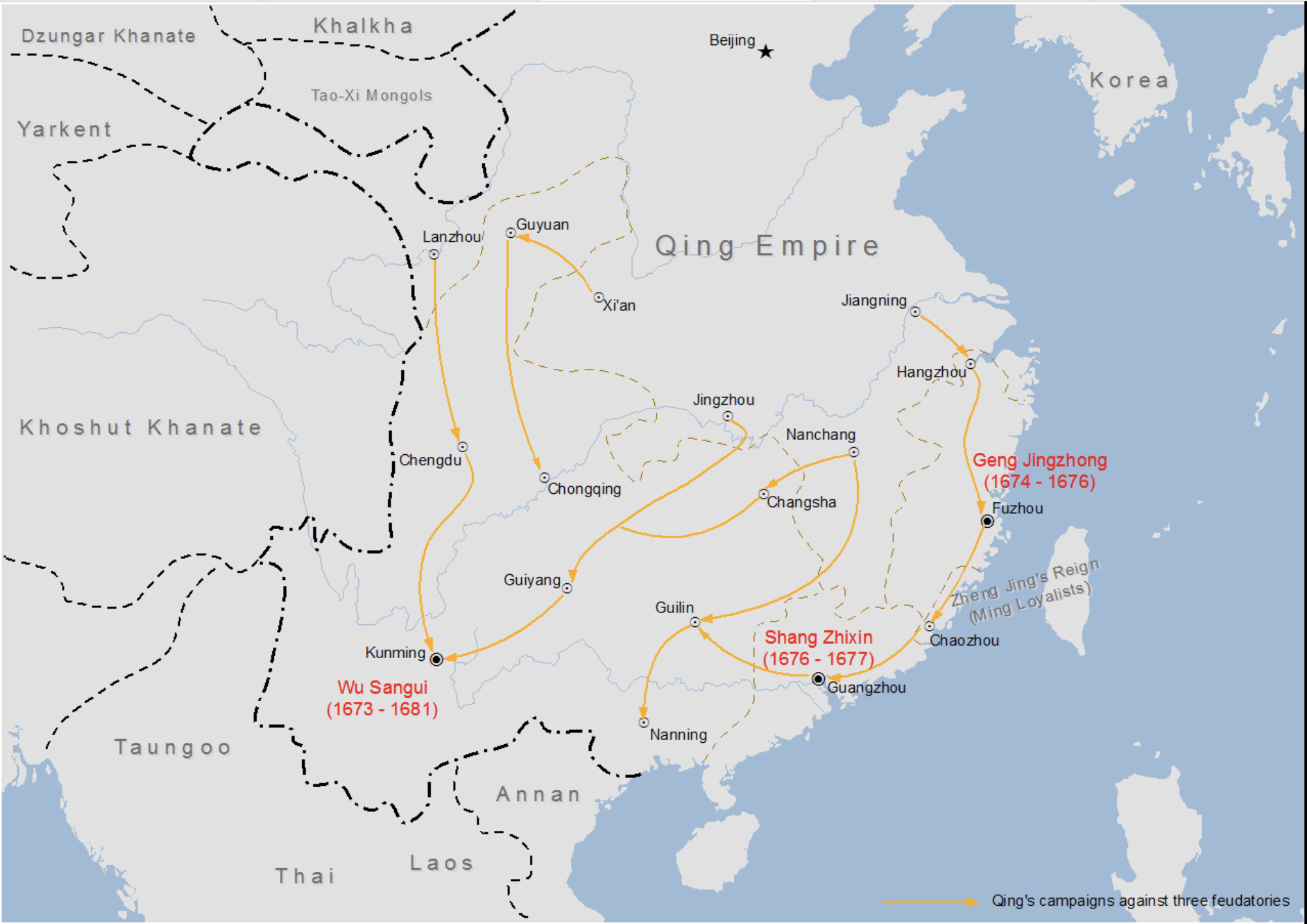 “Aunque los manchúes se apoderaron de Pekín en 1644, su conquista de China permaneció incompleta durante toda una generación. Tres de sus colaboradores chinos, entre ellos el general Wu Sangui; tomaron el poder de grandes satrapías en China del Sur y del Suroeste, y se atrincheraron en el poder territorial”.