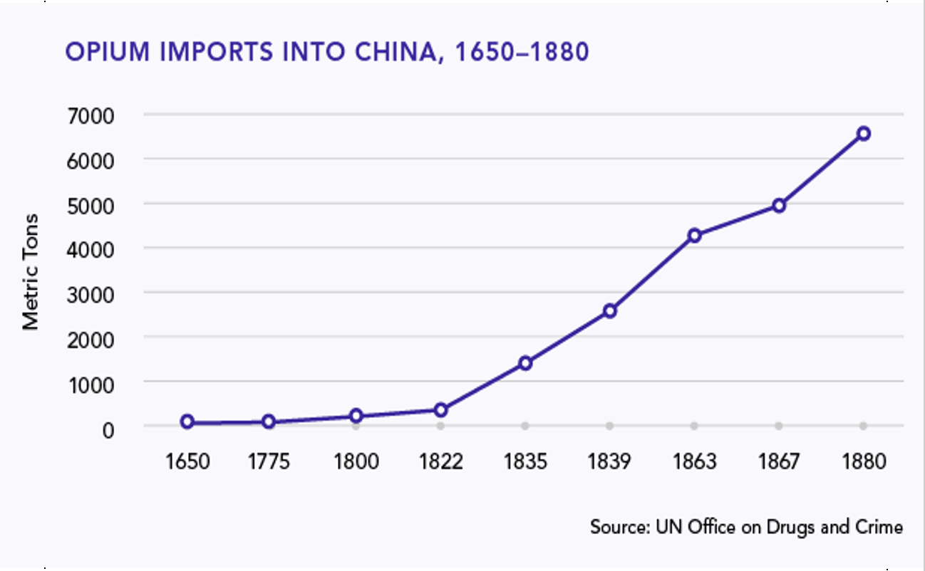 “(…) la creciente demanda europea y estadounidense de té, porcelana, sedas y artículos decorativos chinos no había corrido parejas con un aumento de la demanda china de exportaciones occidentales de artículos de algodón y de lana, pieles, relojes y otras curiosidades mecánicas, estaño y plomo. Los occidentales tenían que pagar los artículos chinos principalmente con plata, y esta afluencia ininterrumpida de plata a China (…) alarmó al gobierno británico”.