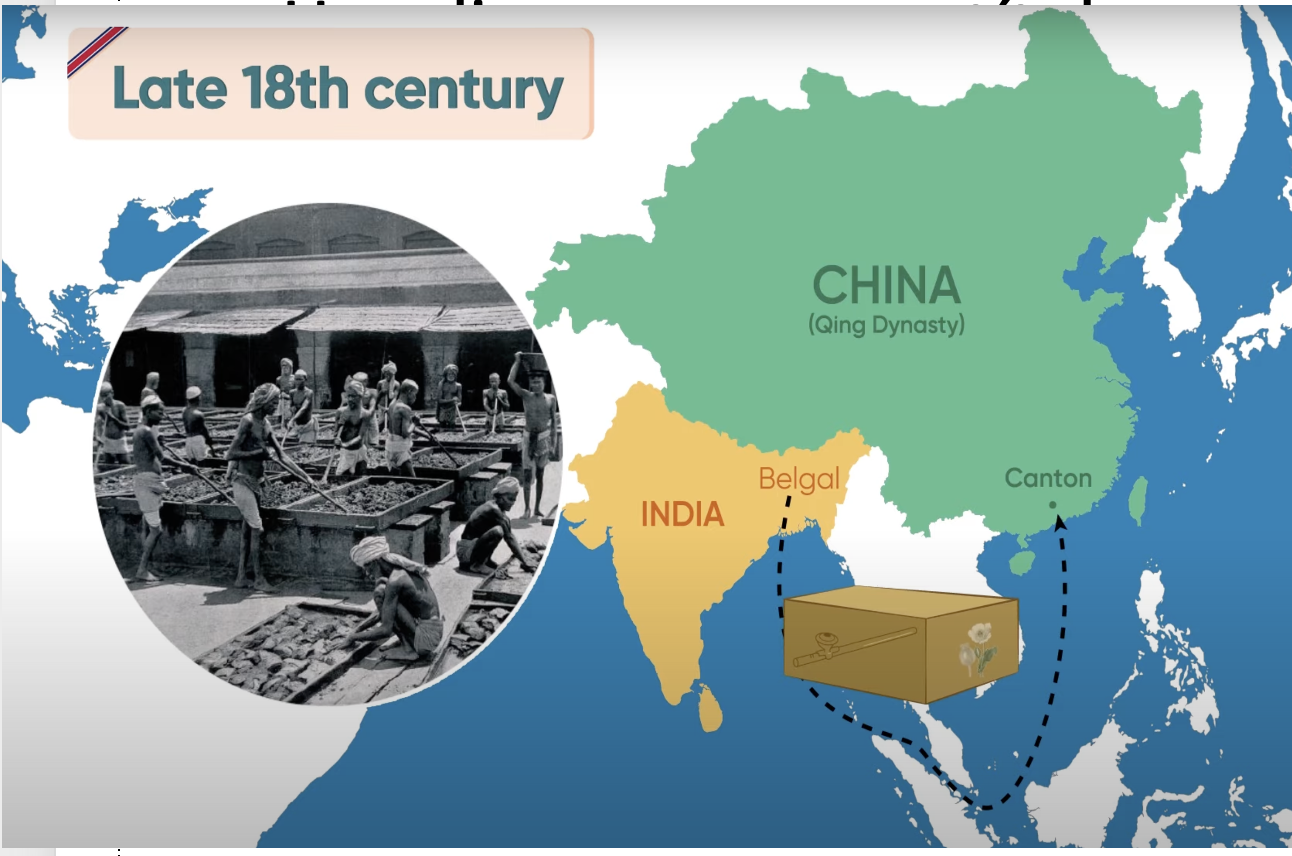 Así, fue con la conquista británica de extensas zonas de la India lo que permitió su producción y comercialización. La Compañía comerciaba indirectamente a través de comerciantes seleccionados y que contaban con una licencia. Las ventas de opio a China pagaban las importaciones de té dirigidas hacia Inglaterra. Los ingleses demandaban productos chinos a cambio de plata, pero los chinos no demandaban productos europeos.